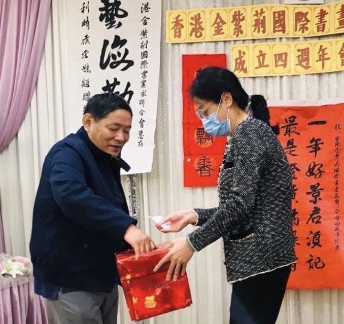 香港金紫荊國際書畫家聯合會顧問、香港書畫藝術筆藝會會長譚佩玉獲得奨品時情景