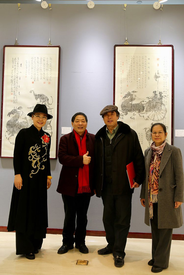 左起:著名藝術家高非、比利時美術家協會主席陸惟華博士、中央國家美術家協會主席王闊海、比利時世界文化藝術交流中心主席侯杏妹在王闊海作品前合影留念